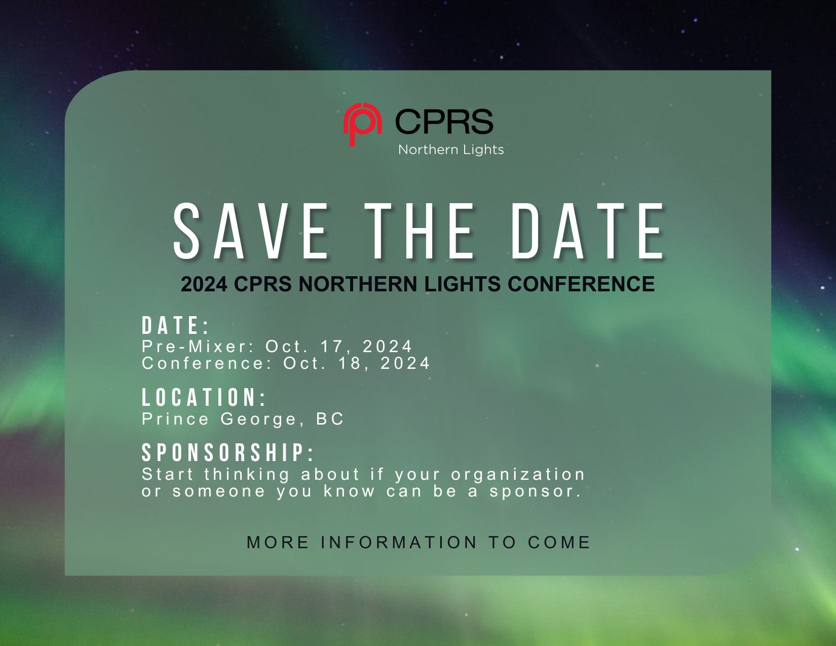 Mark your calendars! CPRS Northern Lights is planning an exciting and engaging one-day conference in Prince George this fall.