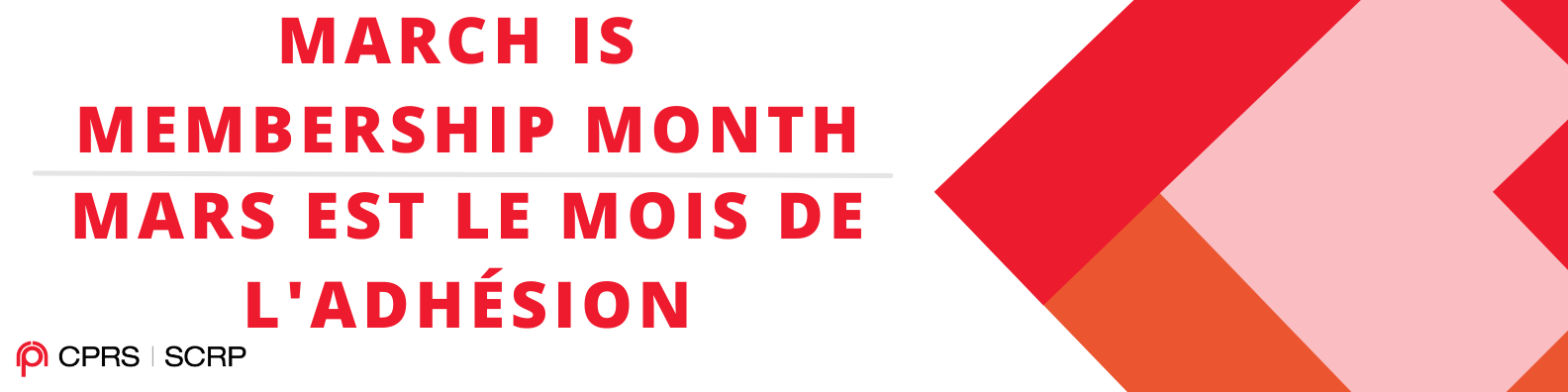 During the month of March, all new and renewing members will be automatically entered into a weekly draw (taking place Mondays) for a chance to win a virtual pass to the 2022 CPRS National Conference (option to upgrade to an in-person pass)! We are also encouraging our members to reach out to your networks to share the benefits you enjoy as a CPRS member – the member who refers the most new members during March will win a one year complimentary membership. Lastly, to encourage new members and renewals, every new member or lapsed member who joins or renews during the campaign period will save $50 off the initiation/reinstatement fee.